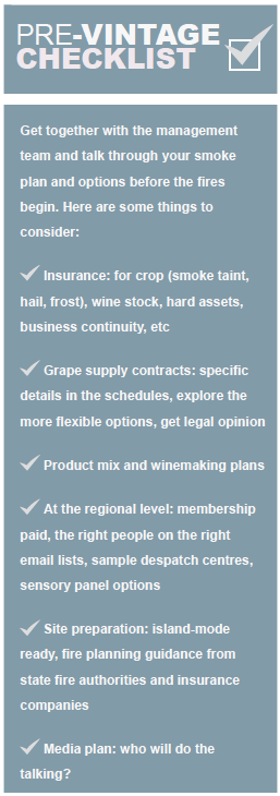 Now one of viticulture’s biggest risk factors, fire and smoke taint need to be planned for and factored into business strategies. With just a few weeks to go before harvest and a mountain of technical information on how to manage the impact of smoke taint already shared by the Australian Wine Research Institute, state and regional wine bodies and others, this article is not so much about winemaking techniques but rather pre-season business preparation. What can the management team do beforehand to maximise flexibility and options? At the risk of mixing proverbs, a battle plan may not survive first contact with the enemy, but failing to plan is certainly planning to fail.